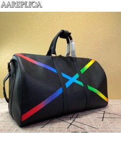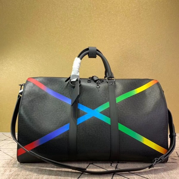 Knockoff LV fake Louis Vuitton Keepall Bandouliere 50 Taiga Rainbow M30345 Fashioned from mat-black Taiga leather with a soft, almost rubbery feel, the Keepall Bandouli??re 50 sports a radiant ??X?? in rainbow colors, the visual signature for the collection from Men??s Artistic Director Virgil Abloh. Louis Vuitton??s iconic soft travel bag, the cabin-friendly Keepall 50 can hold a week??s wardrobe.