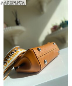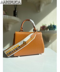 Fake Louis Vuitton LV CLUNY MINI Gold Miel Bag M58931. This exclusive Cluny Mini handbag features a reversible jacquard strap: one side displays the Louis Vuitton logo for a statement look; the other shows Monogram Flowers, for a subtle effect. Made from textured Epi leather, the bag also features an LV signature in smooth resin and a contrasting lining. The strap is removable for a more dressed-up allure.